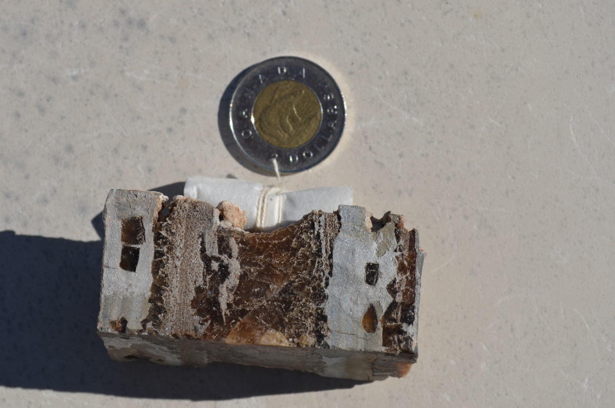 Fragment de carotte sédimentaire provenant d’un forage profond (1,4 km) effectué en Australie Occidentale (Officer Basin). L’échelle est donnée par la pièce de monnaie de 2$ canadiens. Les cristaux de halite de couleur ambre foncé sont inclus dans des couches de silts gris (sables fins). Les roches ont un ?ge d’environ 800 millions d’années. Crédit : Nigel Blamey