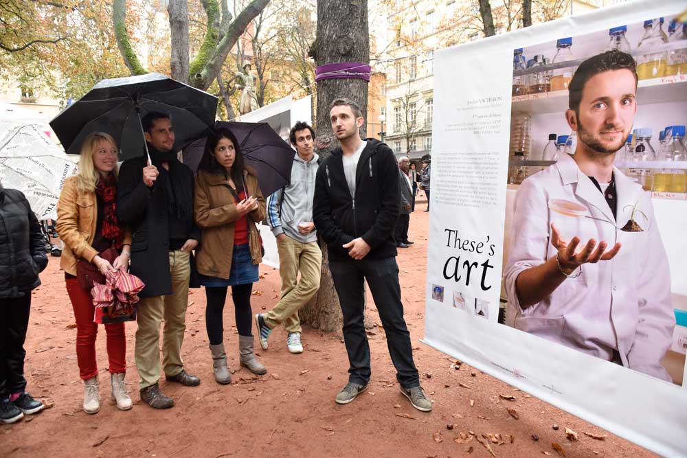 A 11h, après un Flashmob initié par les étudiants de l’IUT Lyon 1, un temps institutionnel a eu lieu en présence de de Fran?ois-No?l Gilly, Président de l'Université Claude Bernard Lyon 1, Cédric Villani, parrain de l'événement, Jean-Luc Mayaud, Président de Lyon 2 et représentant de l'Université de Lyon et Nathalie Perrin-Gilbert, maire du 1er arrondissement de Lyon. Ils ont tous chaleureusement remercié les doctorants Lyon 1 et les équipes présentes, en rappelant l’importance de la thèse dans un cursus personnel, mais aussi son impact sur la recherche et les avancées de la science.